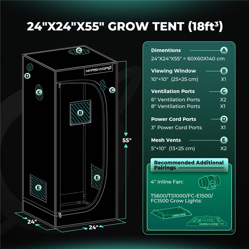 Minőségi Mars Hydro sátor 60 x 60 x 140 cm méretekkel. A nejlonnak, a tartós cipzáraknak és a dupla varrásnak köszönhetően a sátor védett a fényszivárgás ellen. Kivehető mylar alsó betét és 95%-ban fényzáró, szakadásálló. A fényvisszaverő mylar bélés növeli a lámpák intenzitását és fenntartja a megfelelő hőmérsékletet a növények, virágok, gyümölcsök és zöldségek számára. Ideális 1-3 növény elhelyezésére a lakás különböző részein, például szekrényekben, komódokban, erkélyeken... A sátor masszív szerkezetű, amit könnyű alumínium rudak és robusztus fém illesztések biztosítanak. A Mars Hydro TS600, TS1000, FC-E 1500, FC 1500 lámpákhoz ajánljuk.