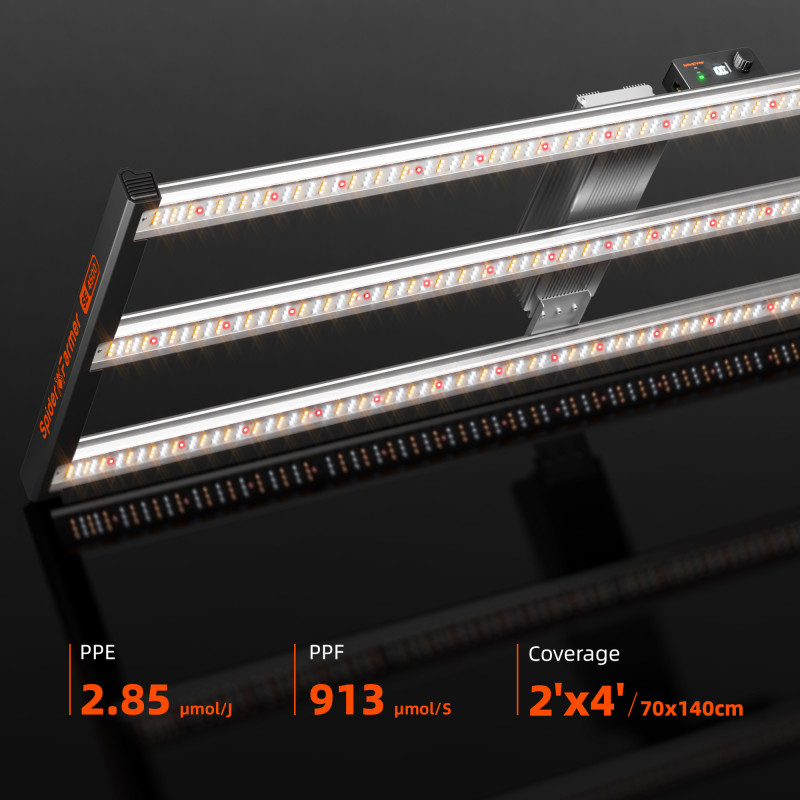A Spider Farmer SE4500 LED-es növénytermesztő lámpája egy nagy teljesítményű és energiatakarékos megoldás beltéri növénytermesztéshez. A csúcskategóriás Samsung LM301H EVO diódáknak köszönhetően 2,85 μmol/J magas hatásfokot és 913 μmol/s fotoszintetikus fluxust ér el, ami erős és egyenletes fénykibocsátást biztosít a teljes területen. A lámpa masszív felépítésű, három LED panellel, amelyek nem igényelnek bonyolult összeszerelést. A telepítés gyors és egyszerű a plug & play rendszernek köszönhetően. Az integrált digitális fényerőszabályzó lehetővé teszi a fényintenzitás pontos beállítását a növények aktuális igényei szerint.