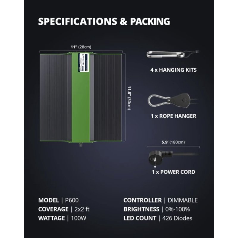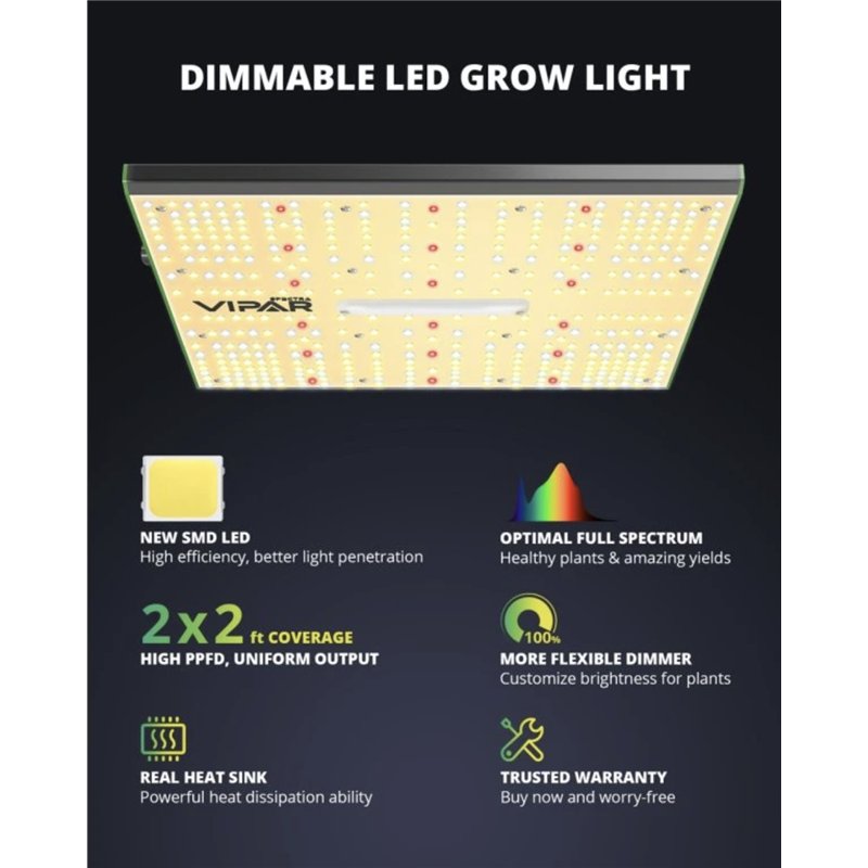Bemutatkozik a ViparSpectra PRO 600/100W-os lámpa, a QB stílusú, nagy teljesítményű LED panelek, ez a sorozat javítja a növények terményhozamát és magas PPE-vel rendelkezik. Ideális mindenféle növényhez és a növekedés minden szakaszában lévő növényekhez. A termék fogyasztása 100 W, élettartama pedig akár 100 000 óra. Továbbá a termék beépített fényerő-szabályozóval rendelkezik. A termék működése teljesen csendes. A terméket passzívan hűti egy nagyobb felületű, kiváló minőségű alumíniumból készült hűtőborda.